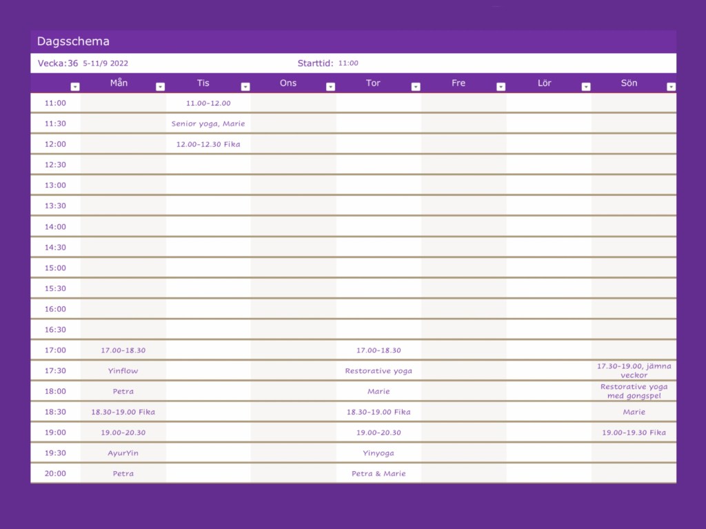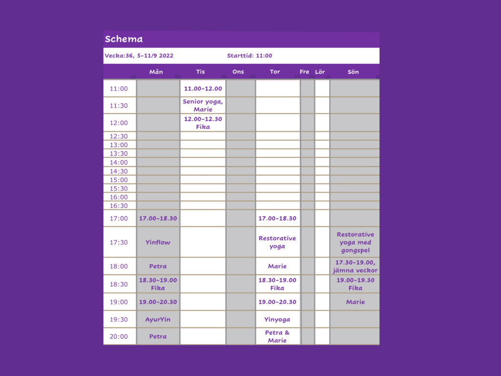Vi har Öppet Hus söndagen den 4/9 kl. 10.00-17.00 då ni kan prova på våra olika yogaklasser gratis. Det kommer ett schema för Öppet Hus-dagen inom de närmsta dagarna. Vecka 36 har vi en invigningsvecka där alla klasser kostar 100kr st (ordinarie pris är 180kr).