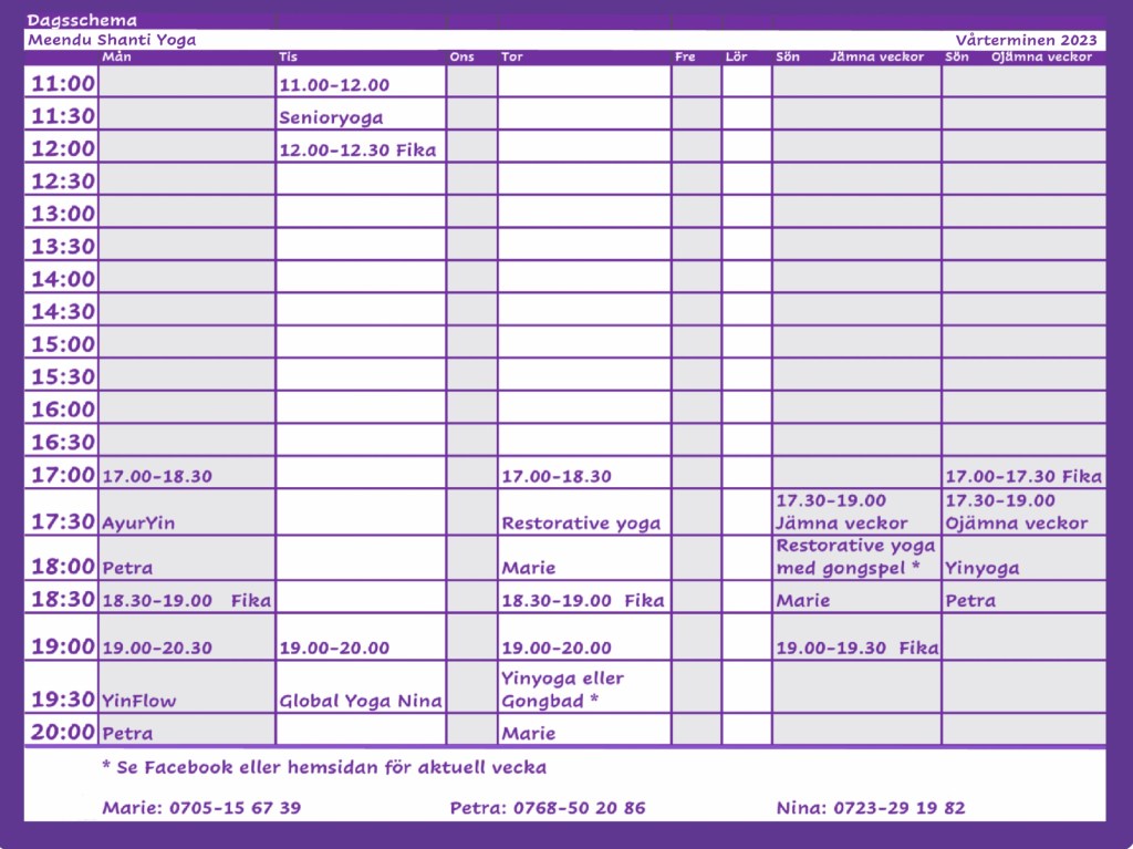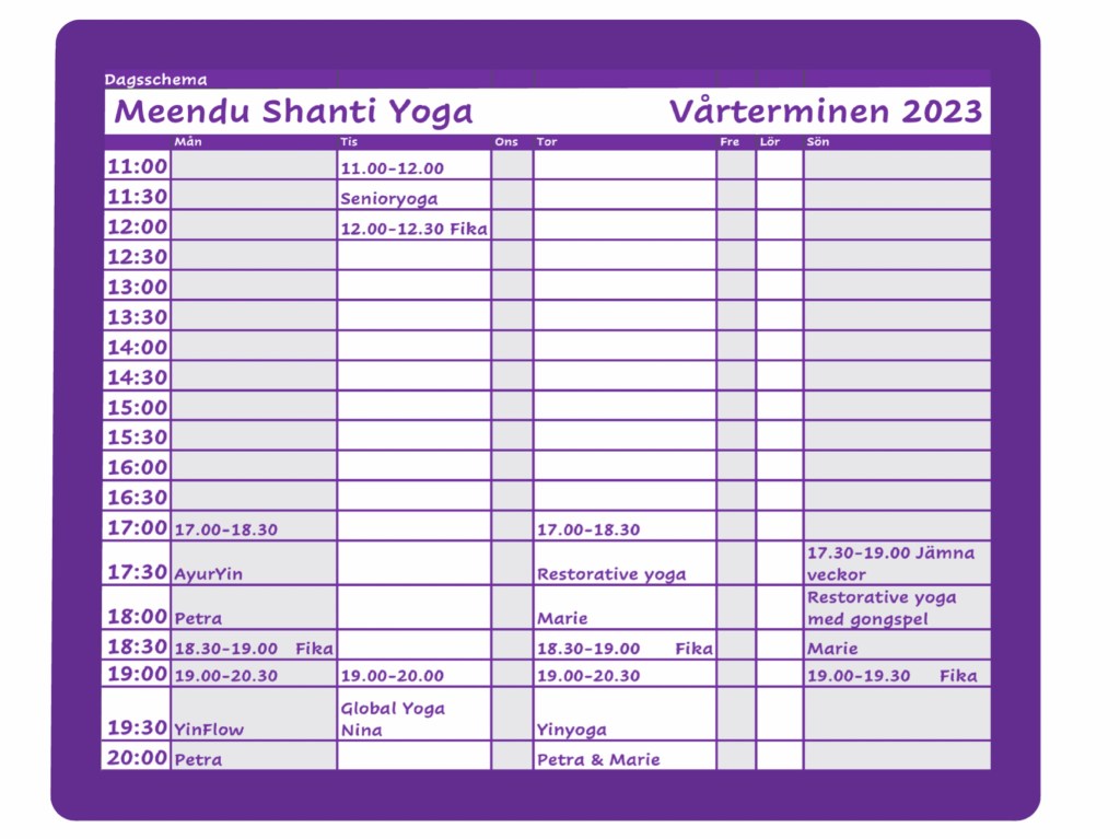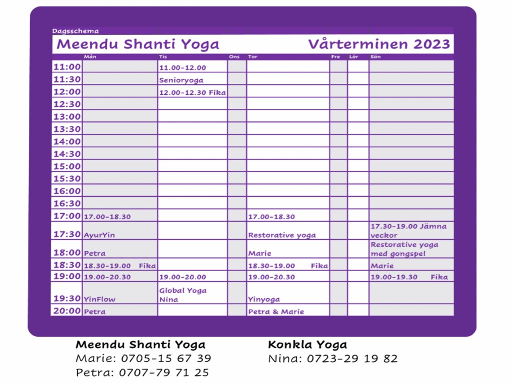 Härpå hemsidan finns all information om Meendu Shanti Yoga, de olika yogaformerna, priser och klippkort.