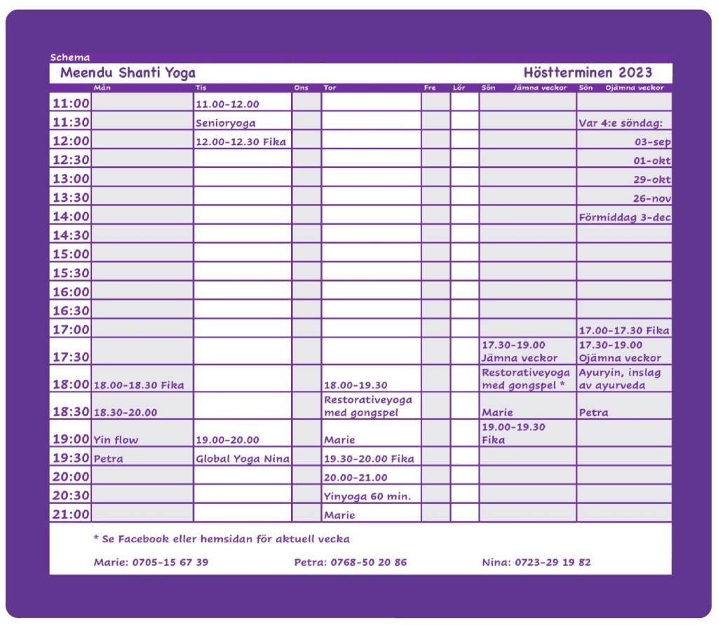 Schemat ovan är vårt ordinarie schema som gäller under höstterminen. Vi kommer att ha lite drop-in klasser och gästläsare utöver vårt ordinarie schema så håll gärna koll på vårt veckoschema som vi lägger ut varje vecka.